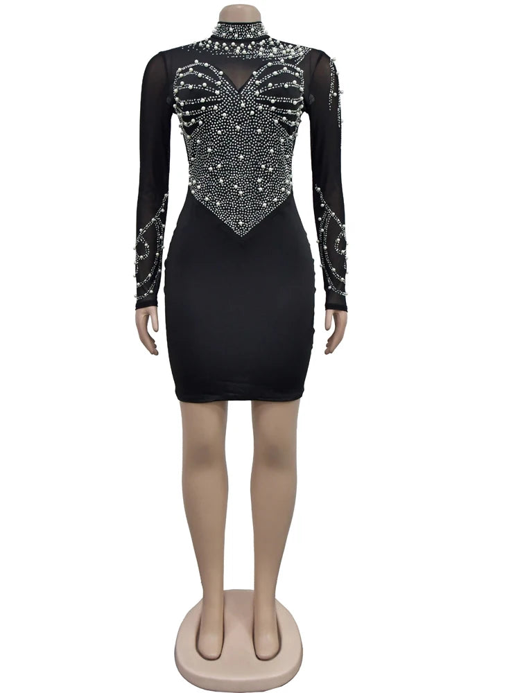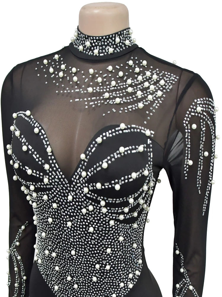 Beyprern Women's Black Mesh Bust Pearls & Rhinestone Décor Long Maxi Dress Glam See-Through Crystal Party Dress Birthday Outfits