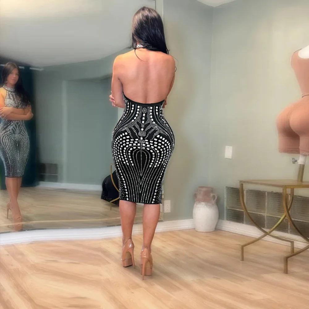 CM.YAYA Women Sleeveless Diamonds Hot Rhinestones Bodycon Midi Dress 2024 Fall Sexy Street Party Club Evening Birthday Dresses