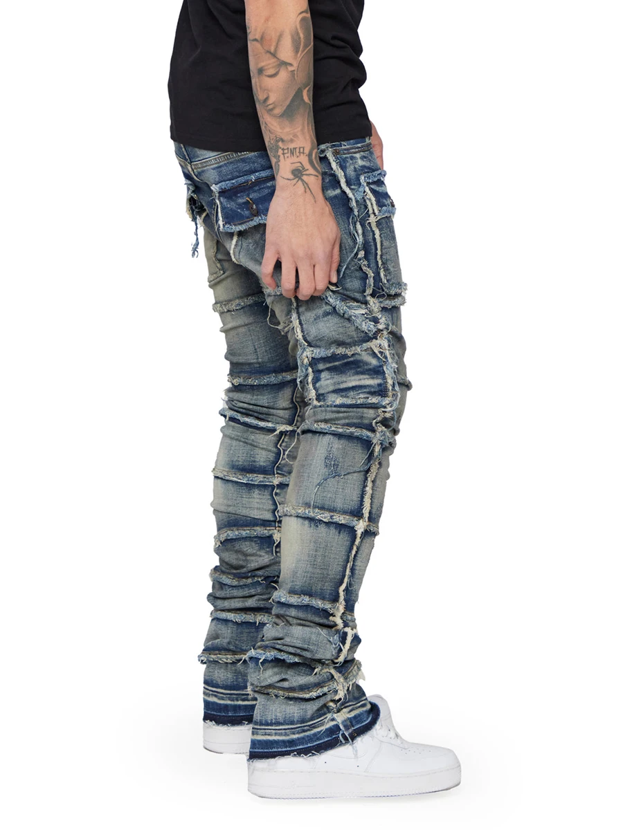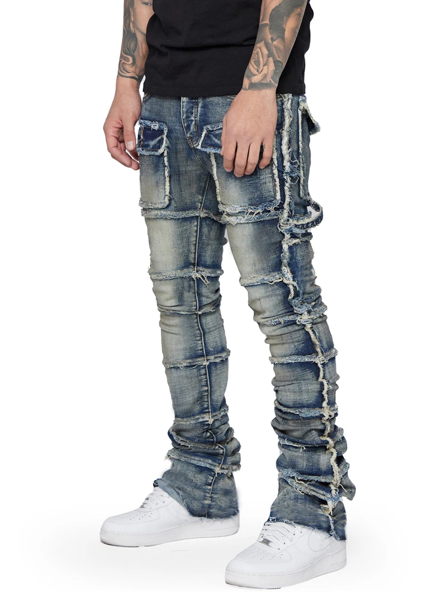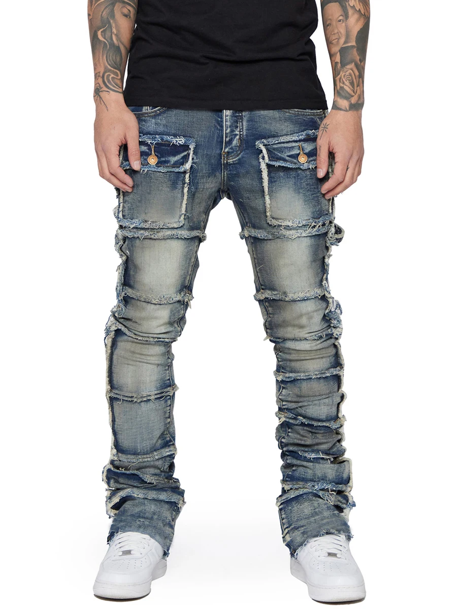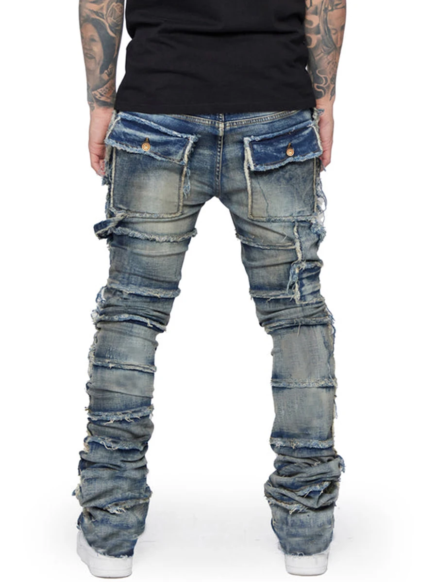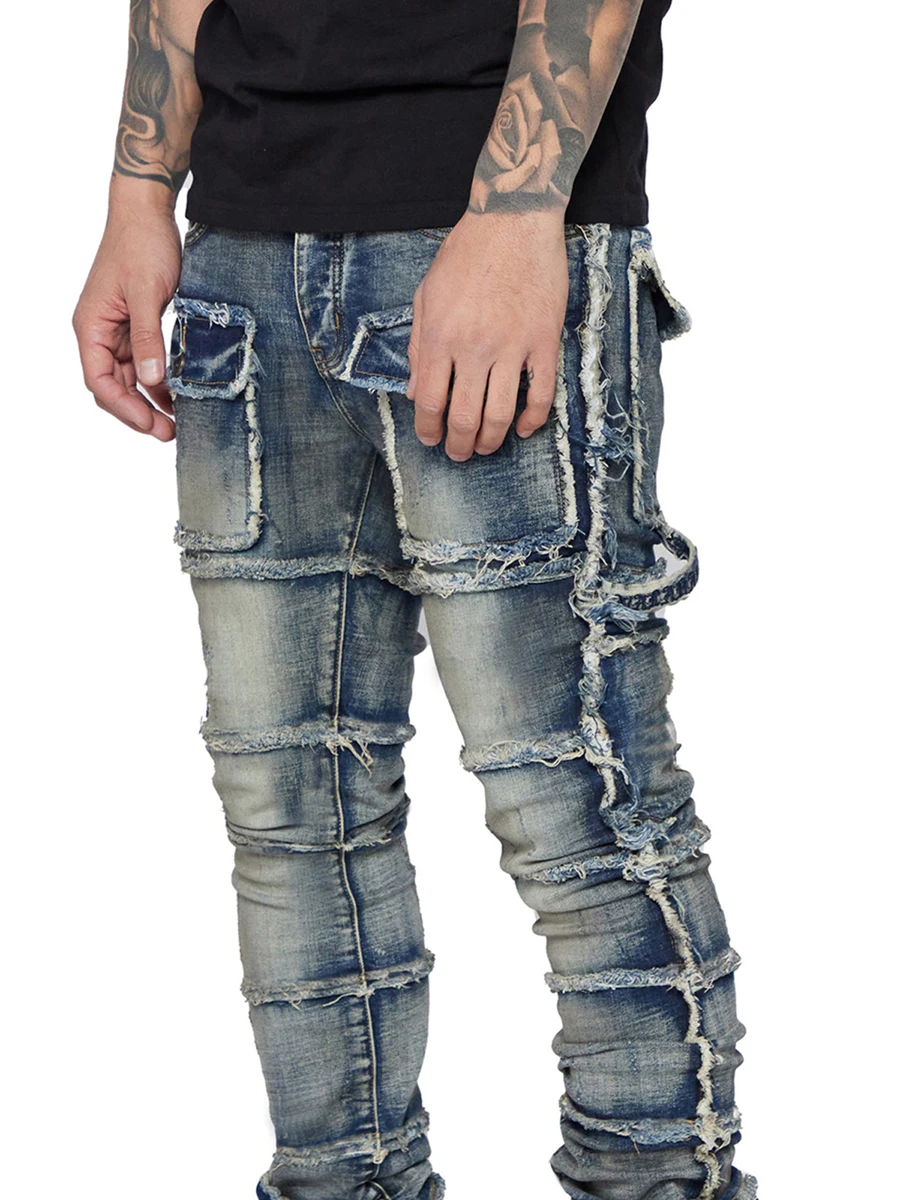 Men's Slim Fit Ripped Jeans Distressed Patchwork Stacked Straight Leg Stretch Denim Pants with Pockets Retro Streetwear