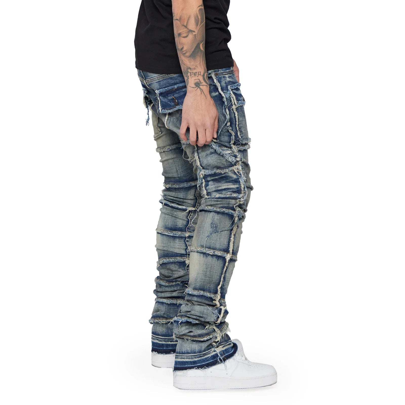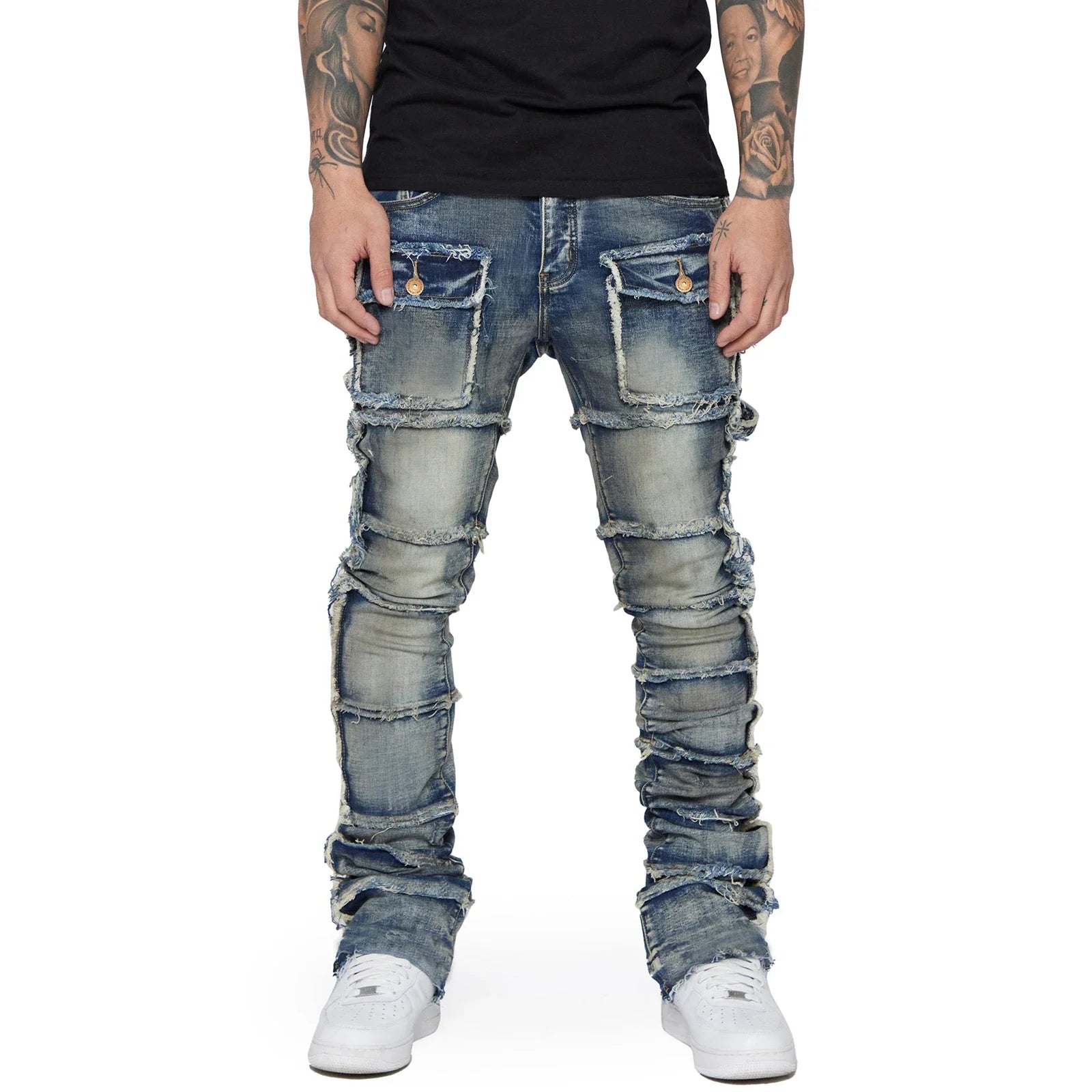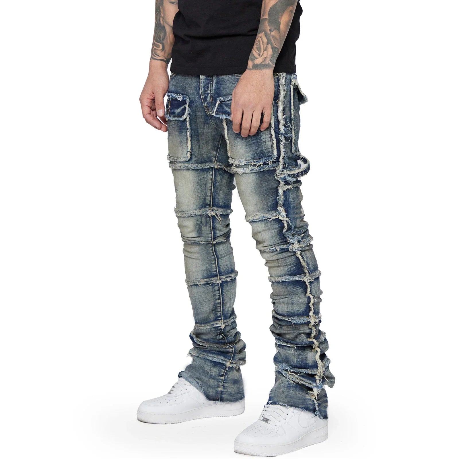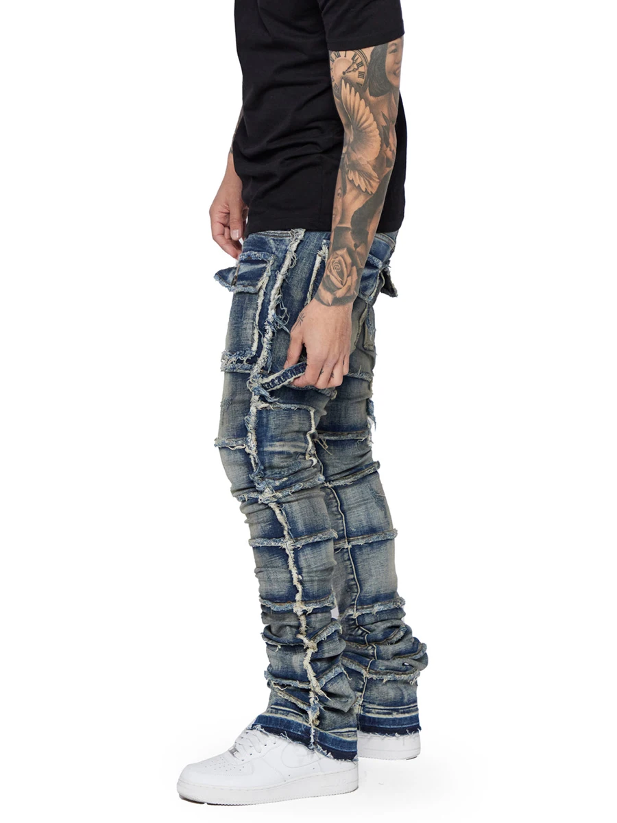 Men's Slim Fit Ripped Jeans Distressed Patchwork Stacked Straight Leg Stretch Denim Pants with Pockets Retro Streetwear