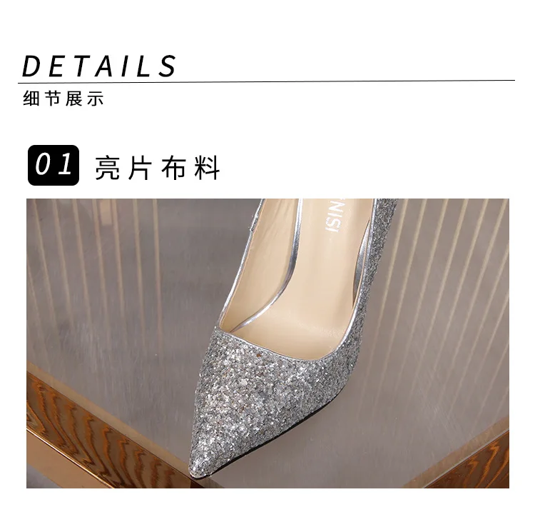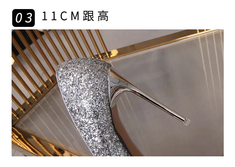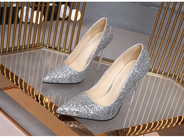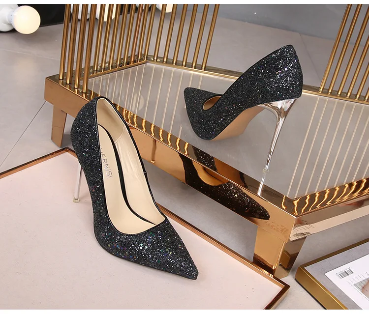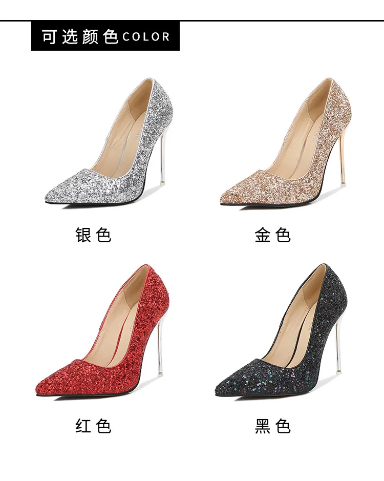 New Glitter Sexy Fetish Pointed Toe 11cm Bride Fashion Elegant Full Dress Models Show Thin Heels Office Lady Mature Flash Queen