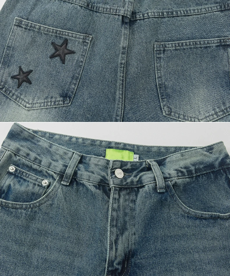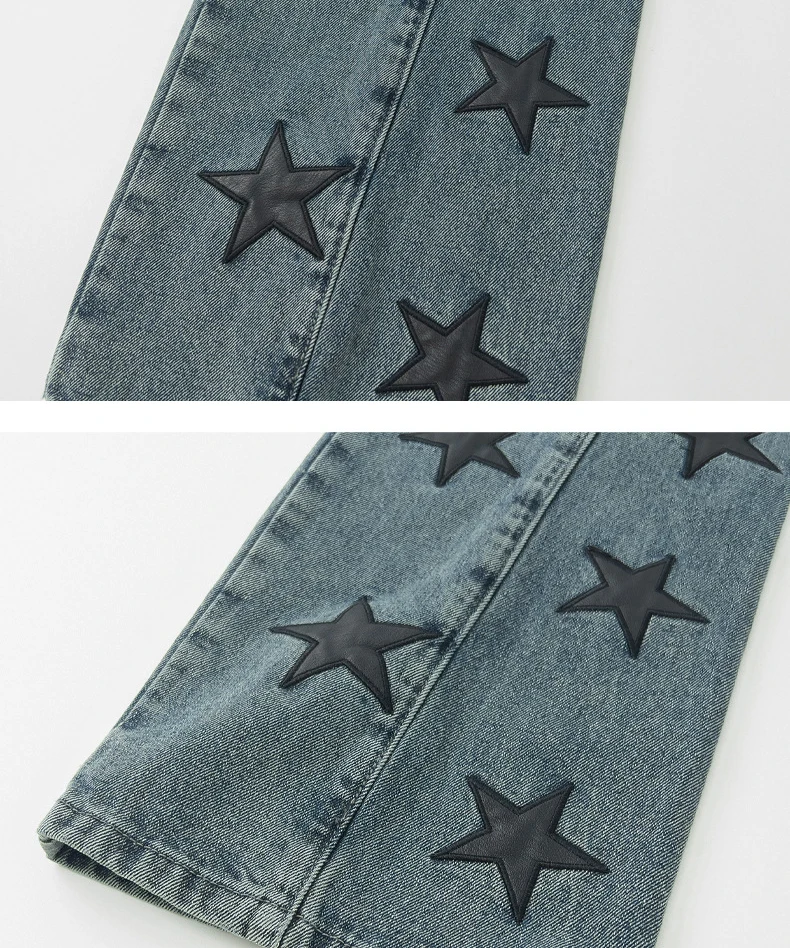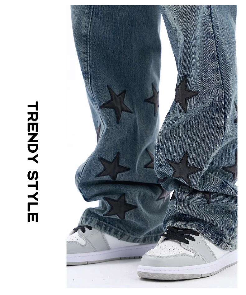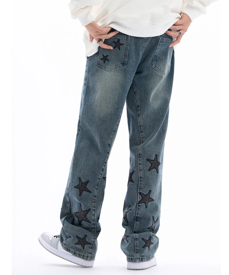 Original Loose Star Leather Jeans Men Washed High Street Hip Hop Straight Casual Pants