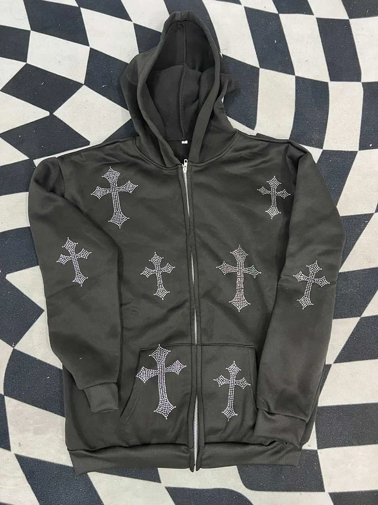 Rhinestone Gothic Streetwear Green Zipup Hoodie Y2k Hip Hop Joggers Sweatshirt Korean Fashion Punk Sport Coat Pullover