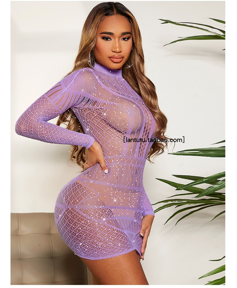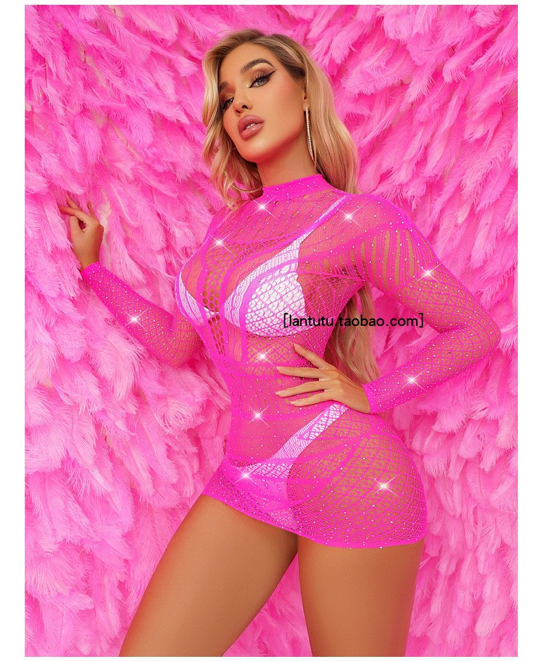 Rhinestone One-Piece Jacquard with Long Sleeves Dress round Neck Cut Out Pattern Sexy Elastic Waist-Tightening Hip Skirt