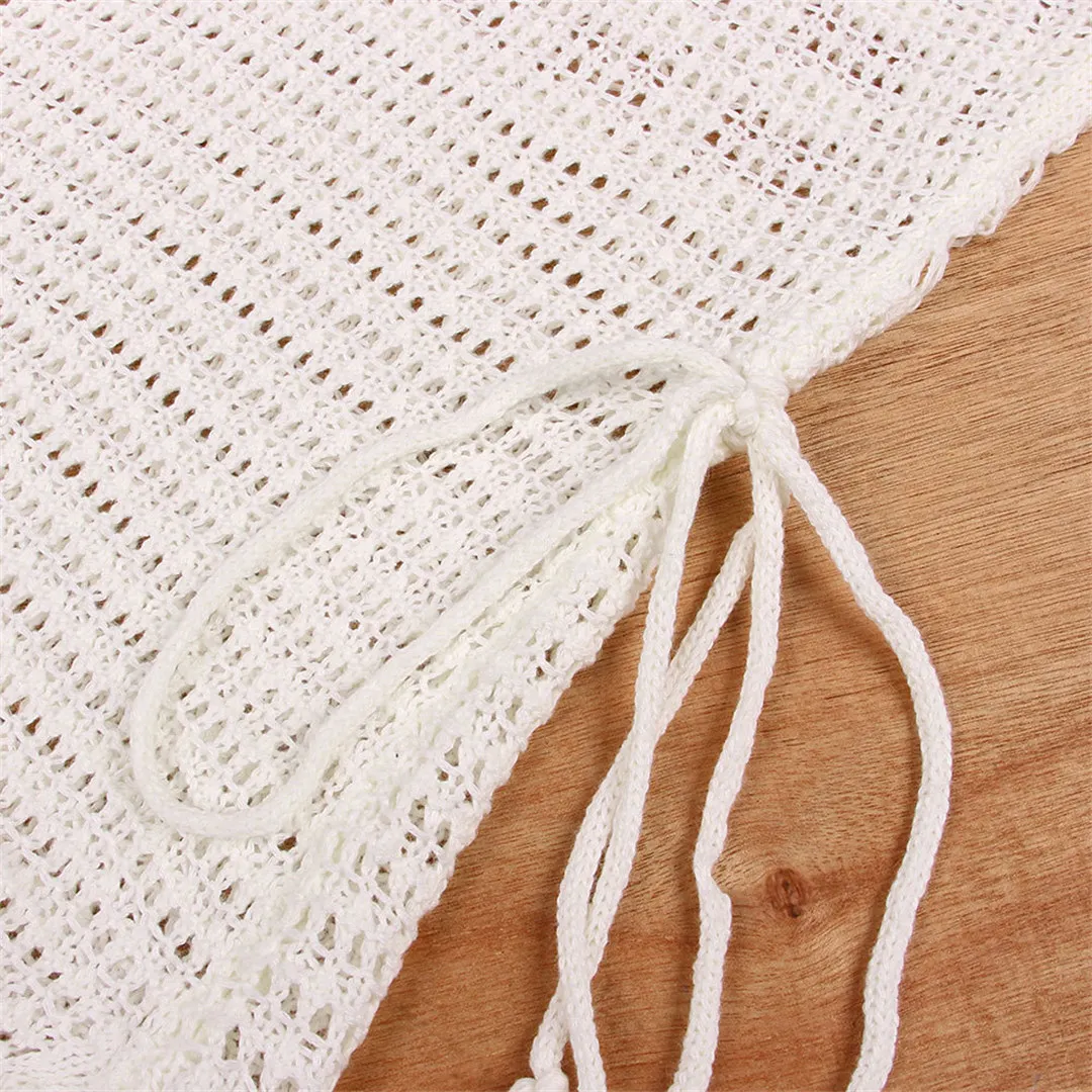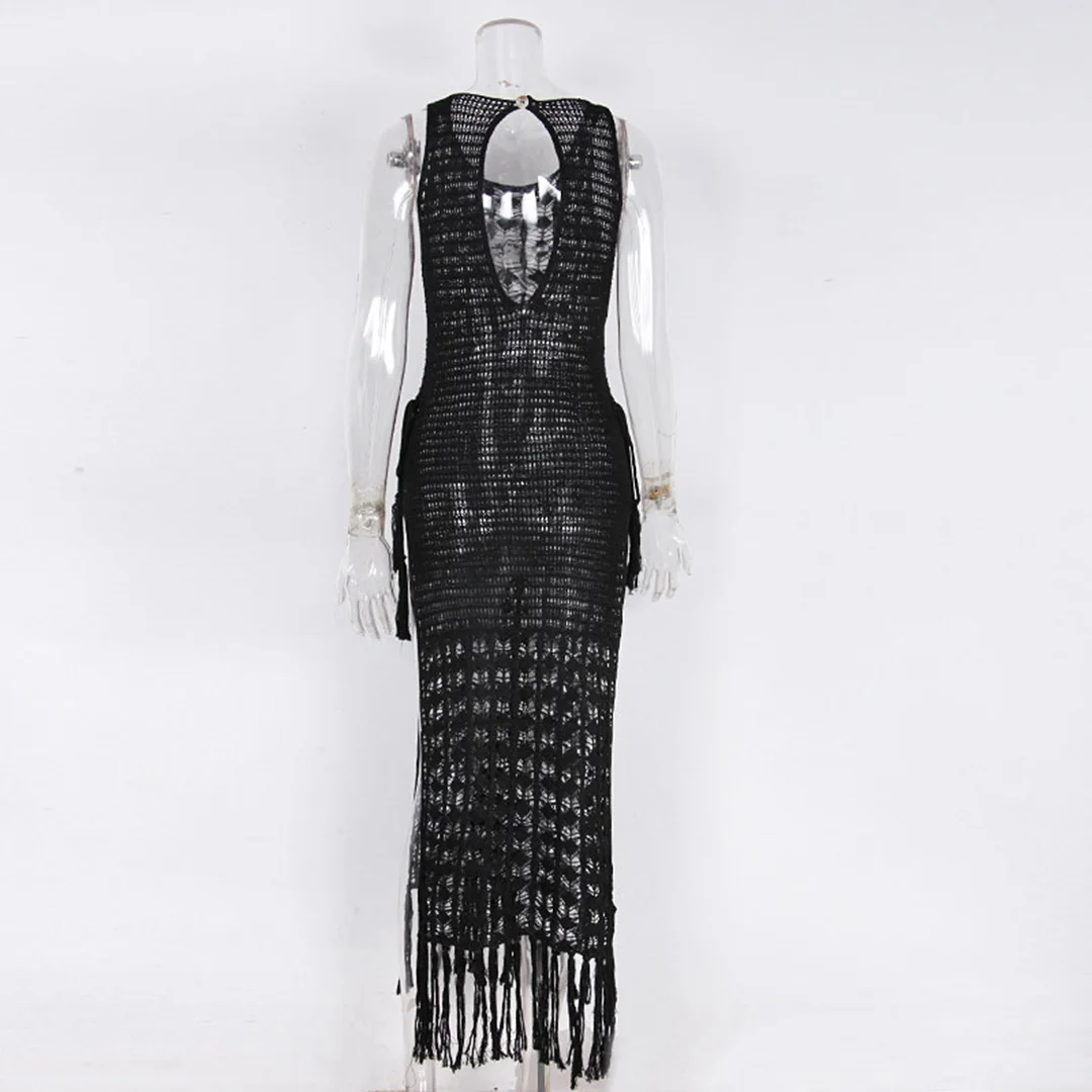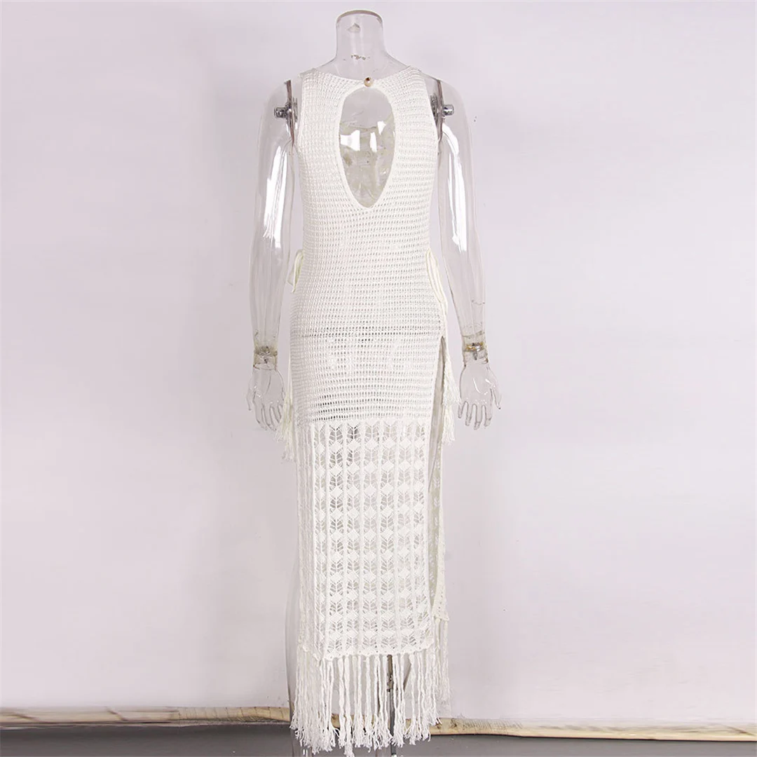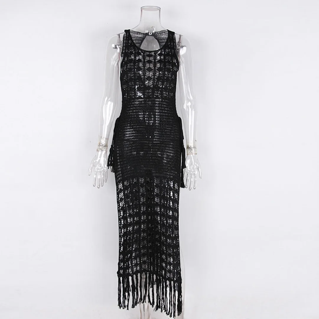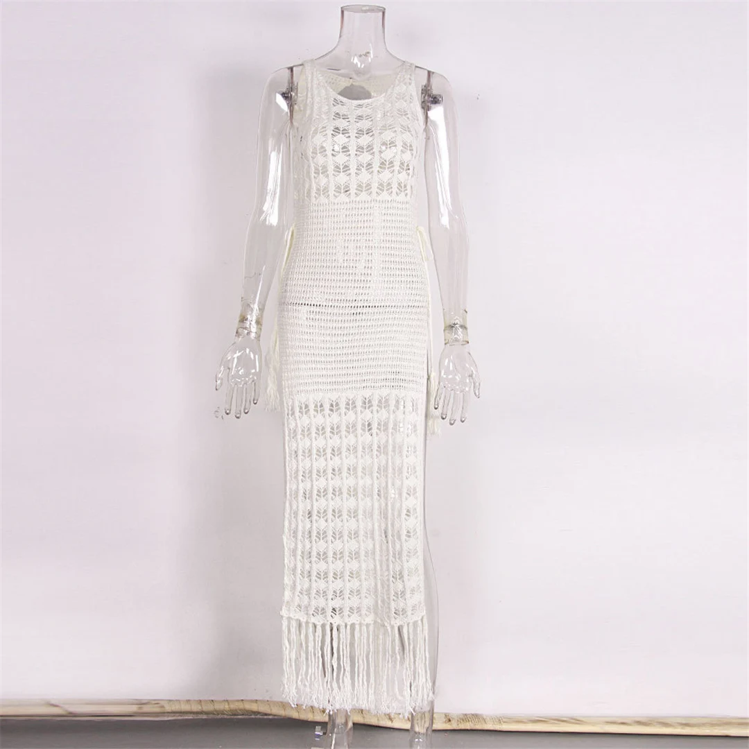 S- XL Sexy Hollow Out Fringe Tassel Knitted Crochet Tunic Beach Cover Up Cover-ups Beach Dress Beach Wear Beachwear Female V3800