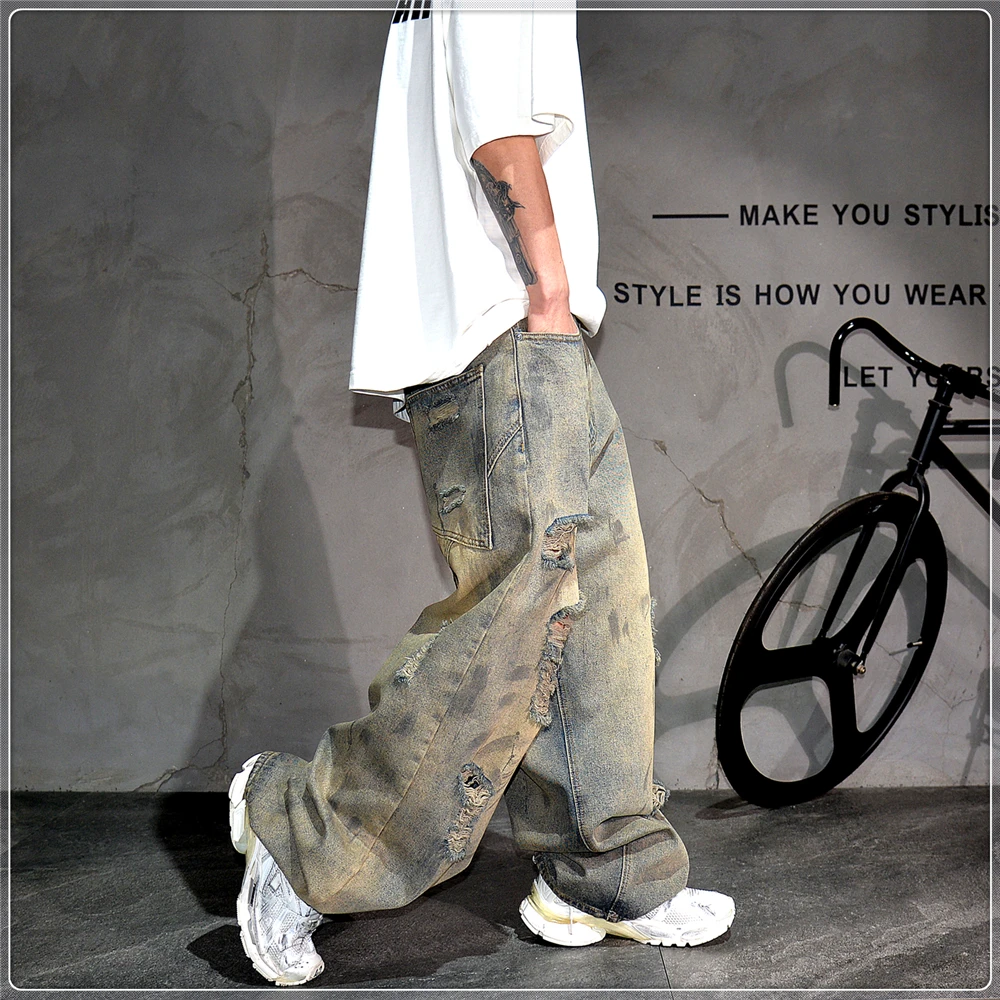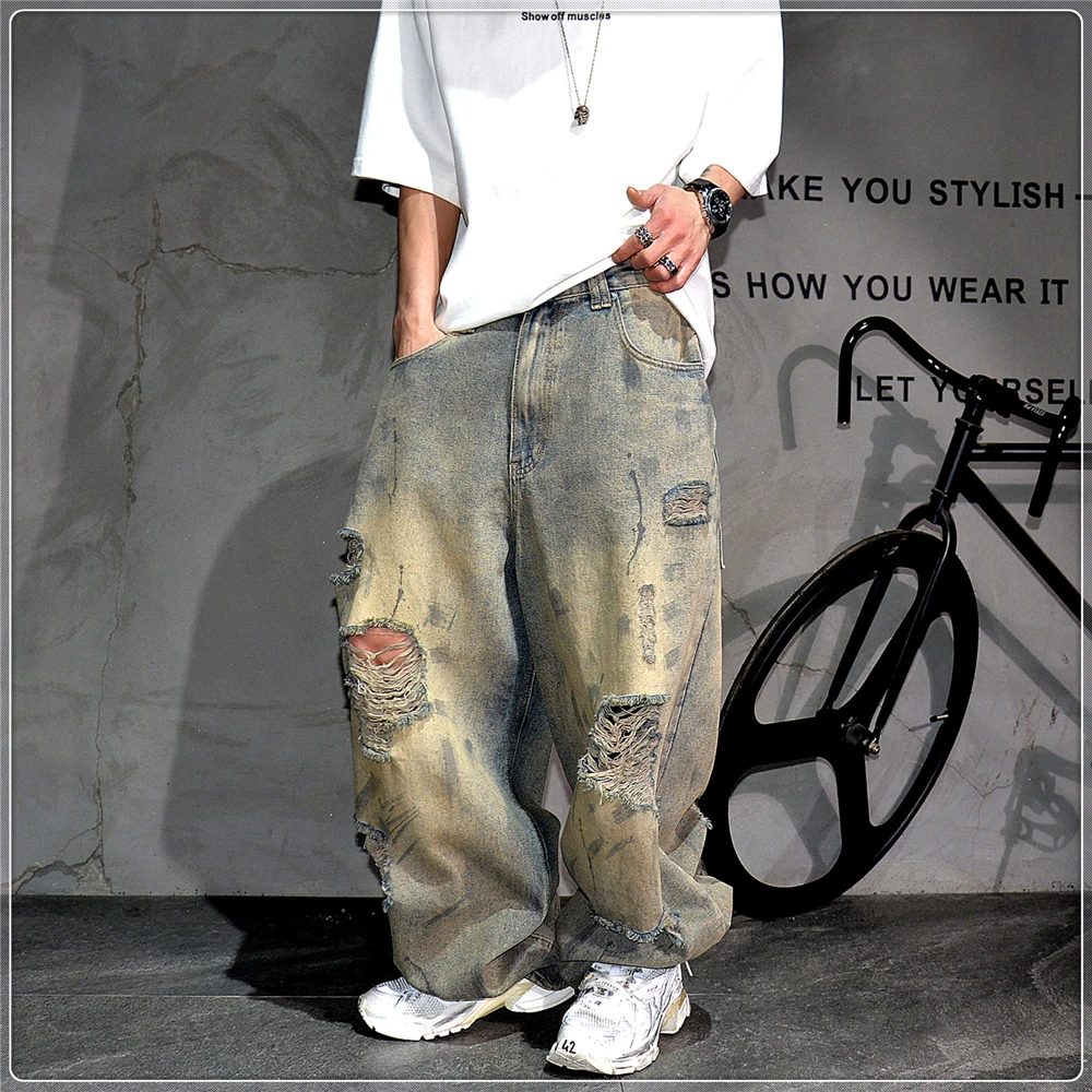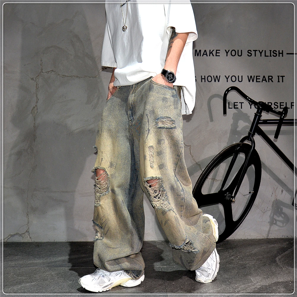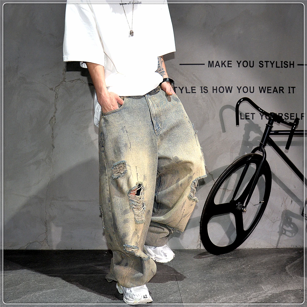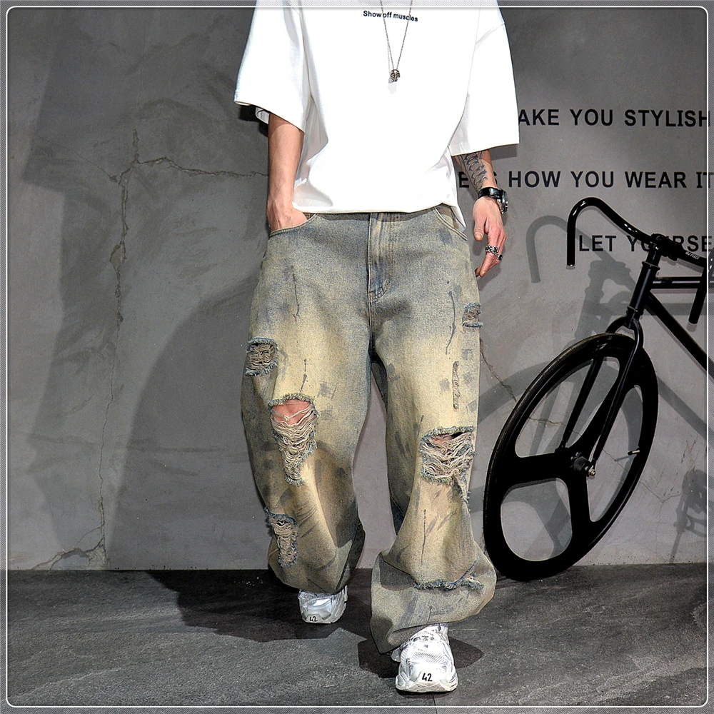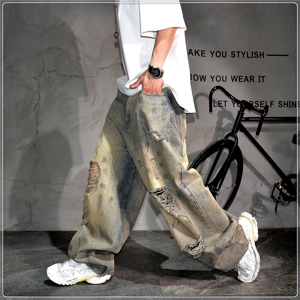 Streetwear Baggy Jeans Men Ripped Distressed Denim Pants Hip Hop Stacked Vintage Skateboard Straight Leg High Quality Trousers