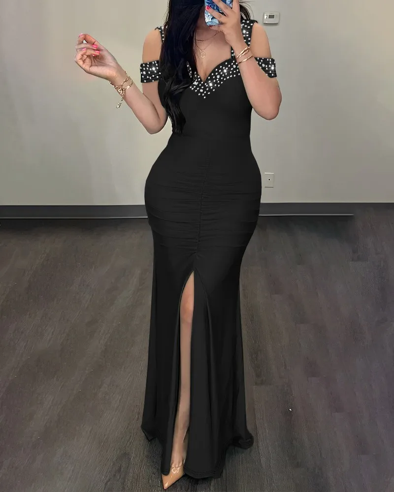Summer Bodycon Dress Women Diamond Party Dresses Split Off Shoulder Sleeveless Casual Loose Elegant A Line Long Y2k Vestidos